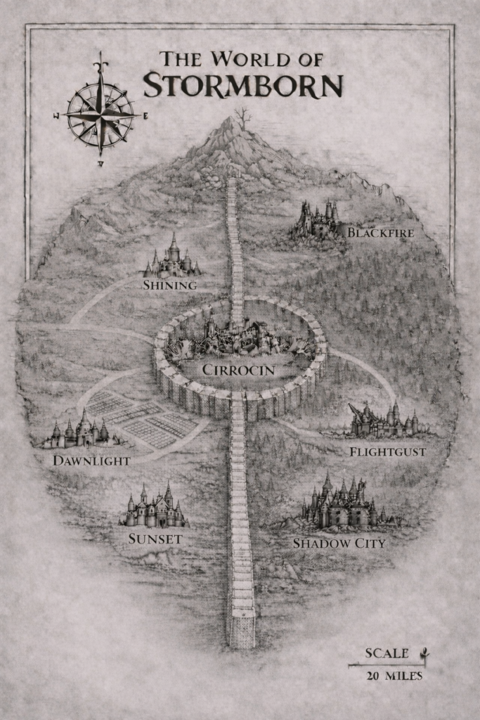 A brilliant city of mirrors and light, ruled by Cirri Moonsliver. Beauty, influence, and quiet manipulation define its glittering streets.